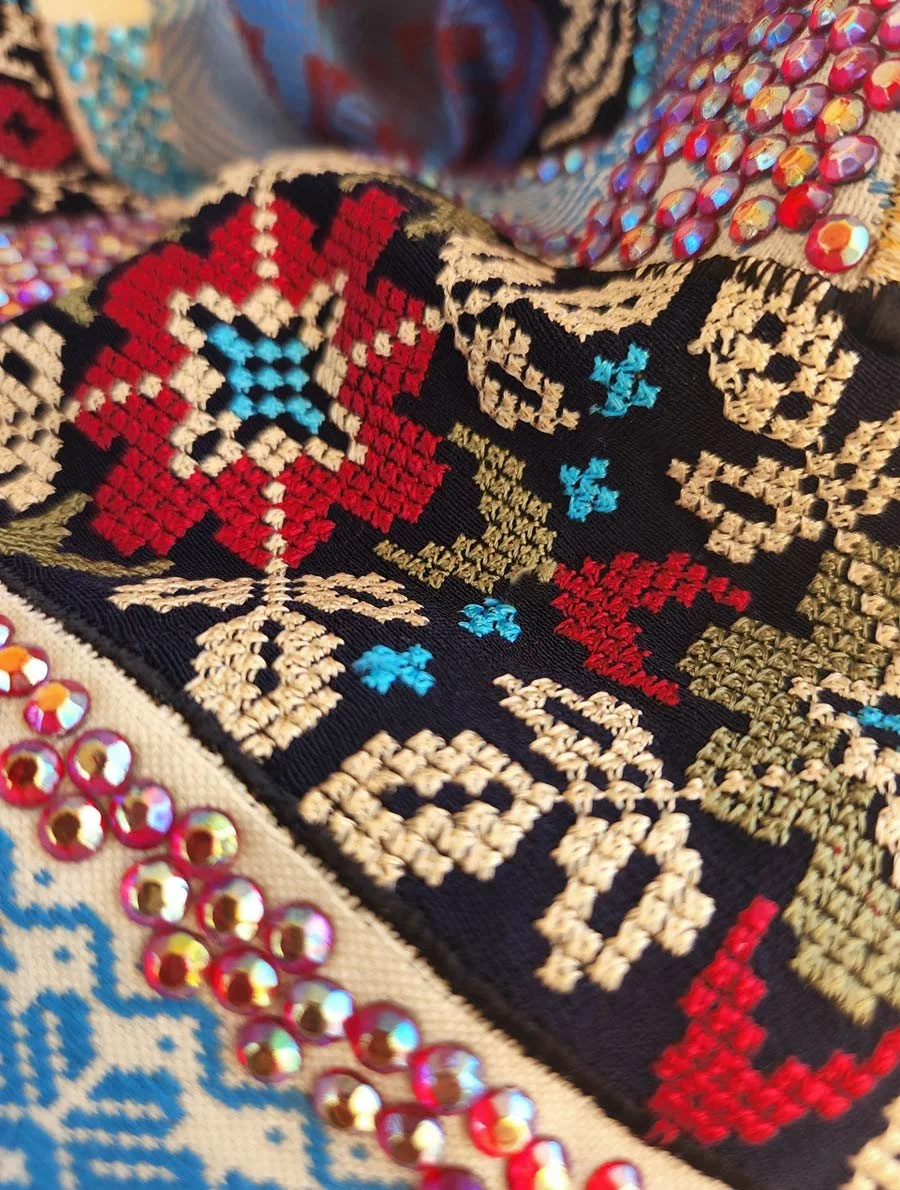 Combination of keffiyeh the traditional Jordanian\Palestinian scarf with Palestinian Embroidery and strass. Wear a simple outfit and put on one of these amazing keffiyeh scarves