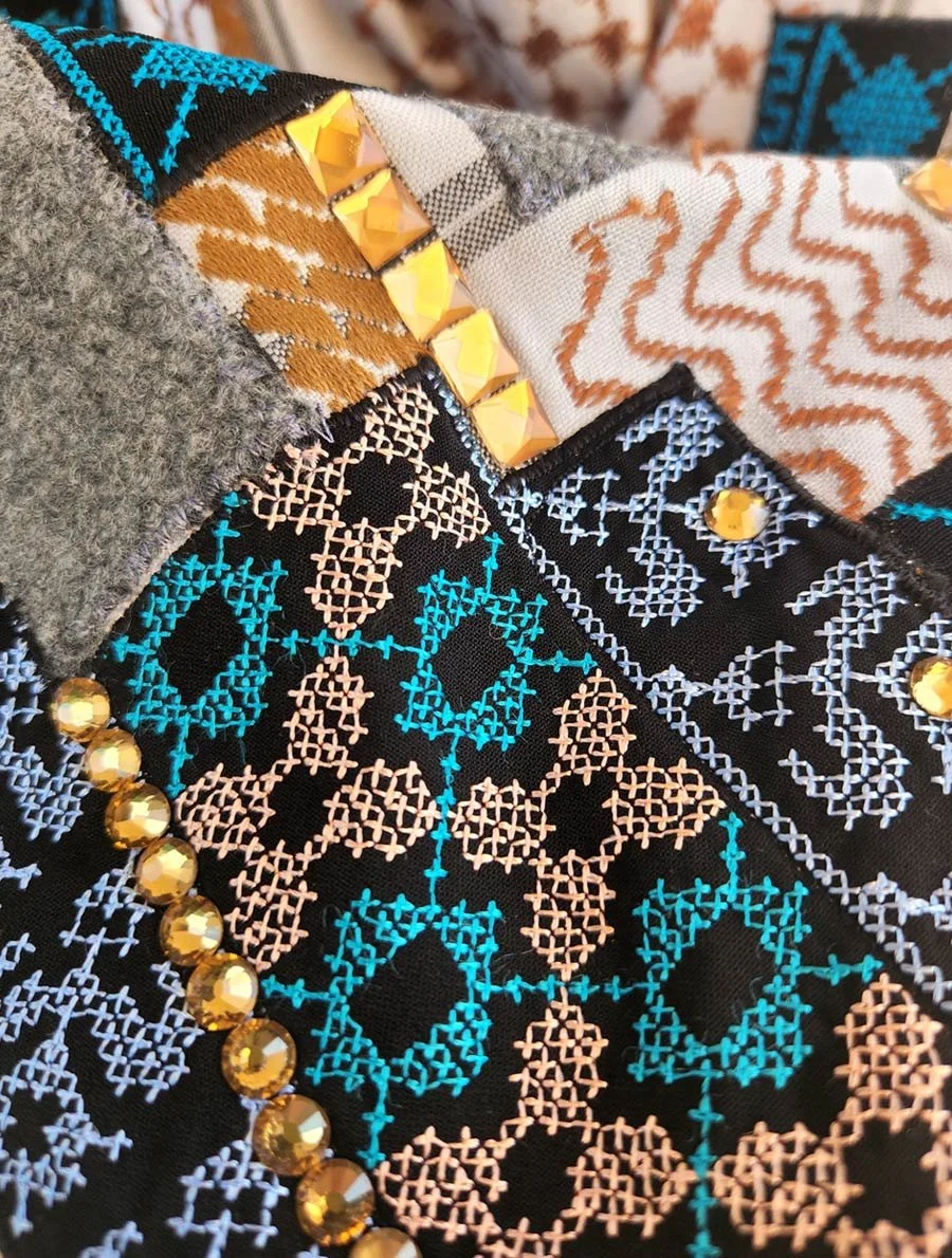 Wrap yourself in timeless style with this Keffiyeh Triangle Scarf, beautifully accented with Palestinian Embroidery, strass and tweed patches made from 20% natural wool. Designed to blend warmth, comfort, and heritage, this scarf features tassels and a rich texture that makes every outfit effortlessly chic